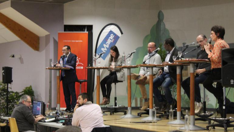 Devant une salle comble, Mathilde Leclerc, Maxime Davoust, Jean-Christophe Couderc et Jocelyn Abbey ont interrogé les candidats sur l'économie et l'attractivité du territoire, la mobilité, la santé, la fiscalité et les finances locales, la sécurité, le cadre de vie et le mieux vivre ensemble. Arnaud Vaslin et Samuel Quignon ont également recueilli des questions posées sur papier par le public.