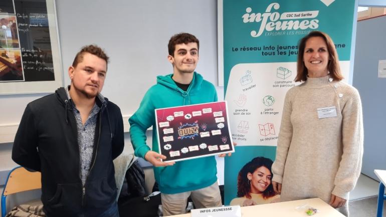 Laure Caignart, Guillaume Gasnier, Gwenc'hlan Le Calvez et des élèves ont joué à un quiz sur l'orientation proposé par la Communauté de Communes Sud Sarthe