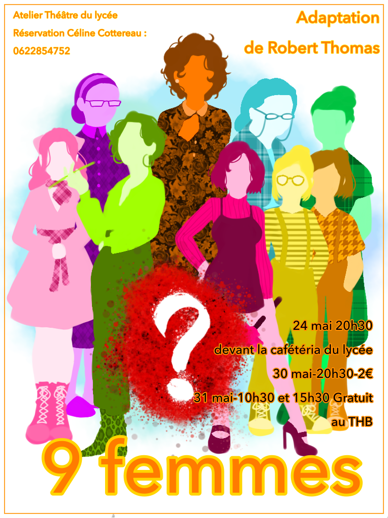 Trois représentations de "9 femmes" sont prévues d'abord le mardi 24 Mai à la tombée de la nuit au lycée en extérieur, sur la nouvelle scène bétonnée cette année 2022, ensuite RDV au THB les 30 et 31 Mai 2022. .