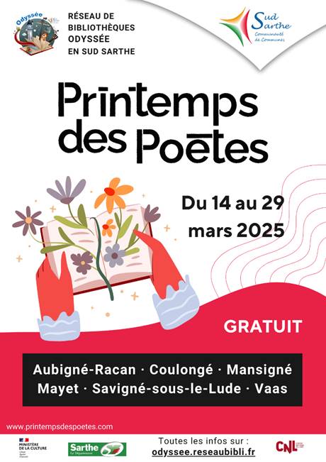 Du 13 au 28 mars 2026, le Sud Sarthe se met aux couleurs du Printemps des Poètes. Le réseau des bibliothèques Odyssée en Sud Sarthe propose un "programme culturel varié et entièrement gratuit, accessible à tous les publics". Six bibliothèques du territoire, Aubigné-Racan, Coulongé, Mayet, Pontvallain, Saint-Jean-de-la-Motte et Vaas, serviront de cadre à l'événement. Lectures, rencontres avec des auteurs, expositions pop-up, ateliers créatifs, et chorale de bénévoles seront au coeur de l'événement..