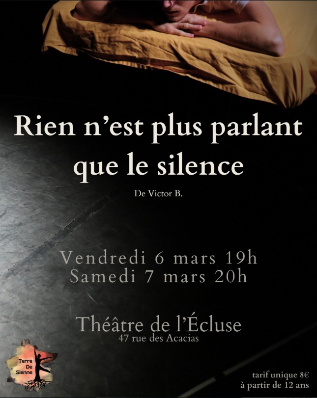Rien n'est plus parlant que le silence ! Le spectacle de la Compagnie Terre de Sienne sera joué au Théâtre de l'Écluse au Mans le Vendredi 6 mars 2026 à 19h et le Samedi 7 mars 2026 à 20h.