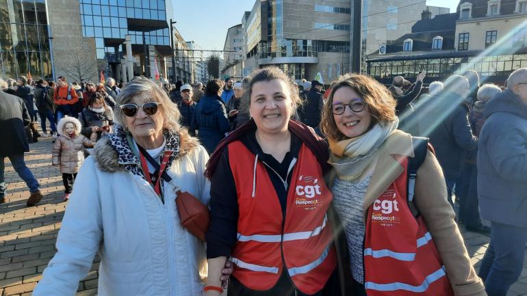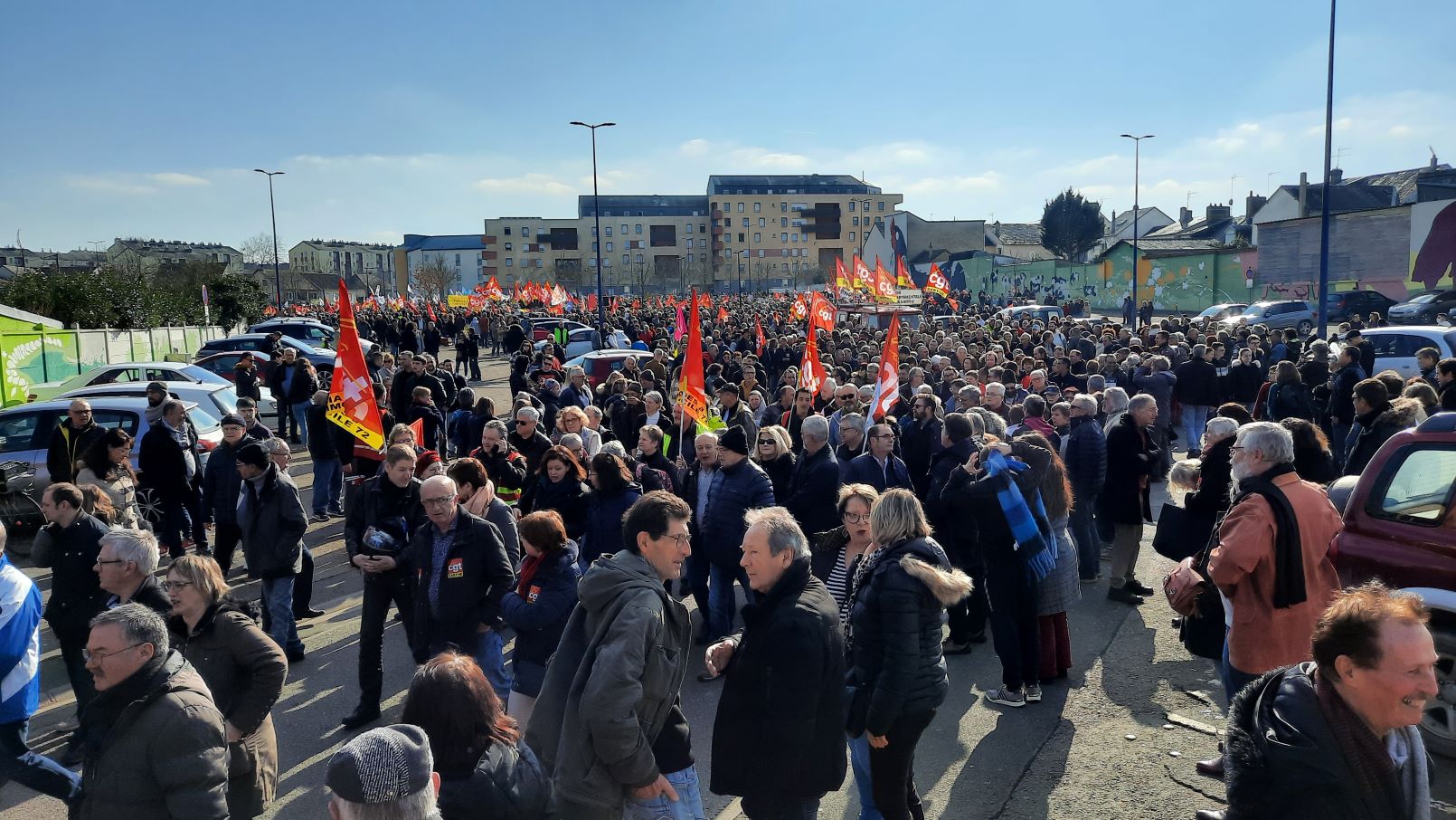 Nouvelle mobilisation contre la réforme des retraites au Mans le samedi 11 février 2023. A l'appel d'une intersyndicale (CFDT, CGT, FO, CFE-CGC, CFT, UNSA, UNEF, Solidaires, FSU) des milliers de personnes (25 000 selon les syndicats et 14 000 selon les autorités) se sont rassemblées sur la Place Henri Vaillant à Pontlieue avant de défiler jusqu'à la Place des Jacobins.