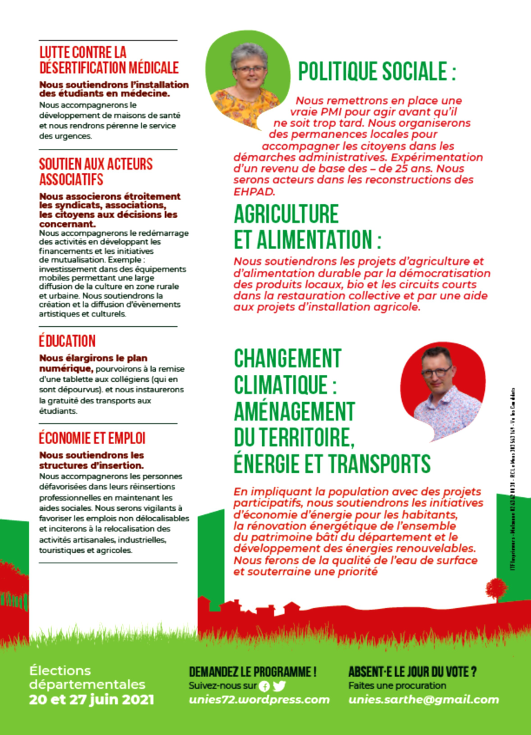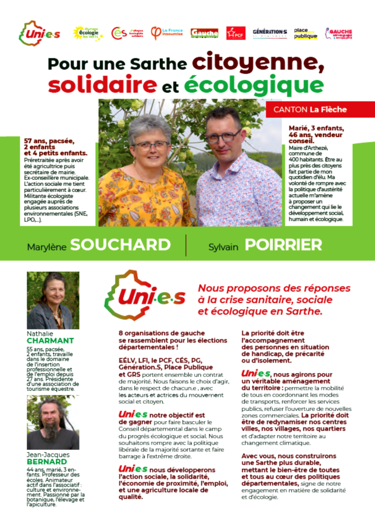 Les 20 et 27 juin 2021, les électeurs du canton de La Flèche, tout comme ceux des vingt autres cantons de la Sarthe, se rendront aux urnes pour élire leurs conseillers départementaux. Marylène Souchard et son binôme Sylvain Poirrier, sont candidats. Leurs remplaçants sont Nathalie Charmant et Jean-Jacques Bernard. Invitée par Radio Prévert, Mme Souchard présente les principales mesures de la liste UNIES (PCF, LFI, EELV, PG et leurs alliés) et les projets pour le canton.
