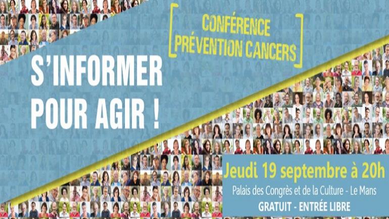 Une Conférence « Prévention Cancers, S'informer pour agir ! » est organisée par la CPAM de la Sarthe en collaboration avec le Comité de Cancérologie du CH du Mans le jeudi 19 Septembre 2019 à 20 h 00 au Palais des Congrès et de la Culture du Mans.