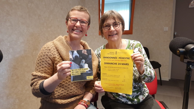Claudine Mathieu et Karine Jourdan-Ferry, respectivement, présidente et membre du groupe local d'Amnesty International à la flèche, présentent la randonnée pédestre organisée le dimanche 24 mars 2024 sur les chemins de randonnée de Saint-Jean-de-la-Motte en soutien aux femmes afghanes. Des" femmes qui petit à petit depuis 2021, sont privées de leurs droits sont bafouées par un pouvoir taliban qui les écrase et les fait, petit à petit, disparaître, en fait, de la société afghane".
