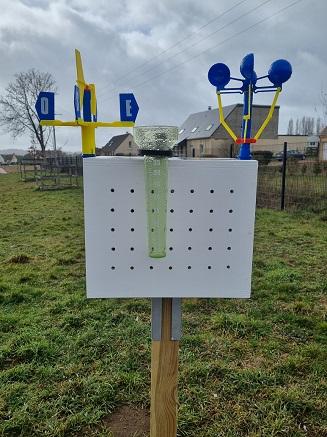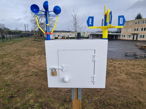 Début mars, un poteau en bois, une boite blanche, des objets dessus, ceci n'est pas un objet non identifié, mais bel et bien une station météo, Mme Bouteiller professeur de physique-chimie et Axel élève en 5 ème ont préparé ce projet depuis des mois avec l'accord de Mme Audouin principale du collège.