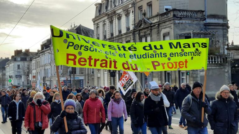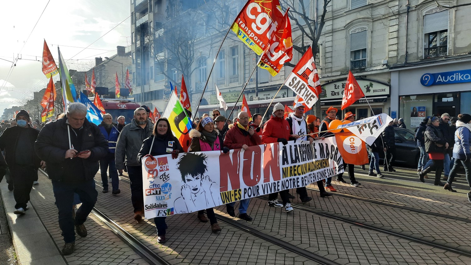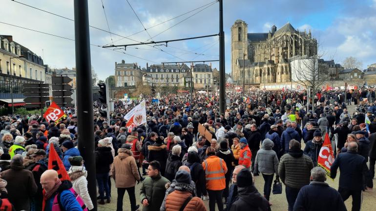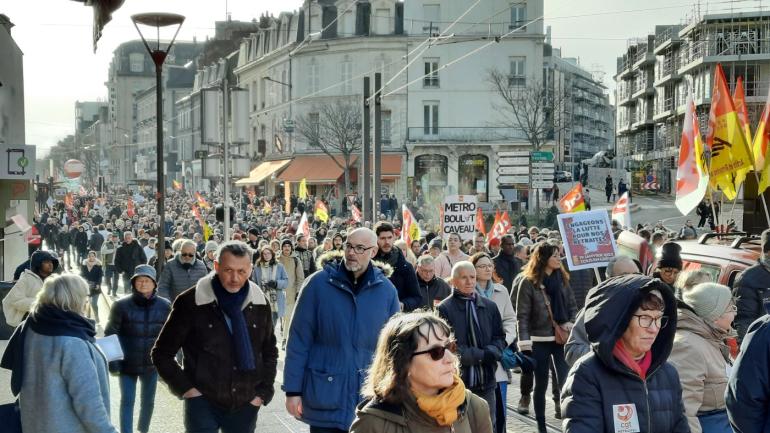 Grande mobilisation au Mans contre la réforme des retraites le 19 janvier 2023. A l'appel d'une intersyndicale (CFDT, CGT, FO, CFE-CGC, CFT, UNSA, UNEF, Solidaires, FSU) des milliers de personnes se sont rassemblées sur la Place des Jacobins après avoir défilé dans les rues du centre-ville.