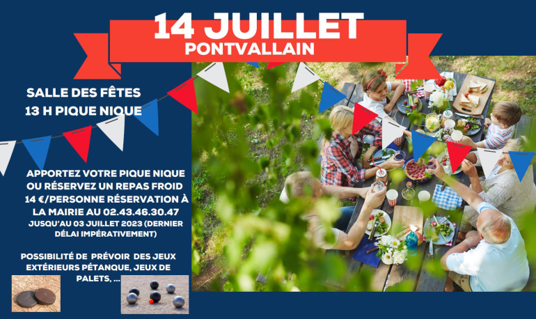 En ce 14 juillet 2023, jour de Fête nationale, la municipalité de Pontvallain organise un pique-nique et des concerts gratuits à la Salle des fêtes. Guillaume Gasnier, conseiller municipal, présente le programme de l'évènement.